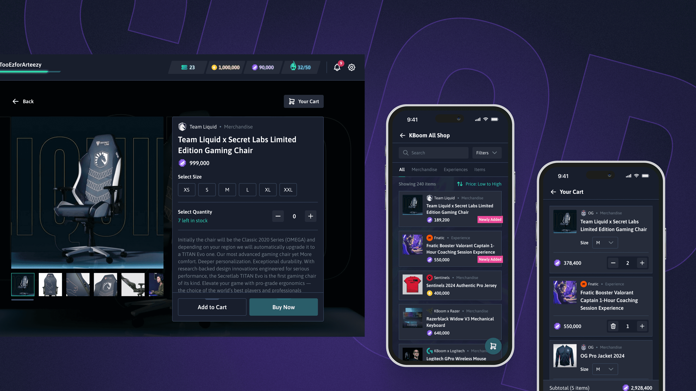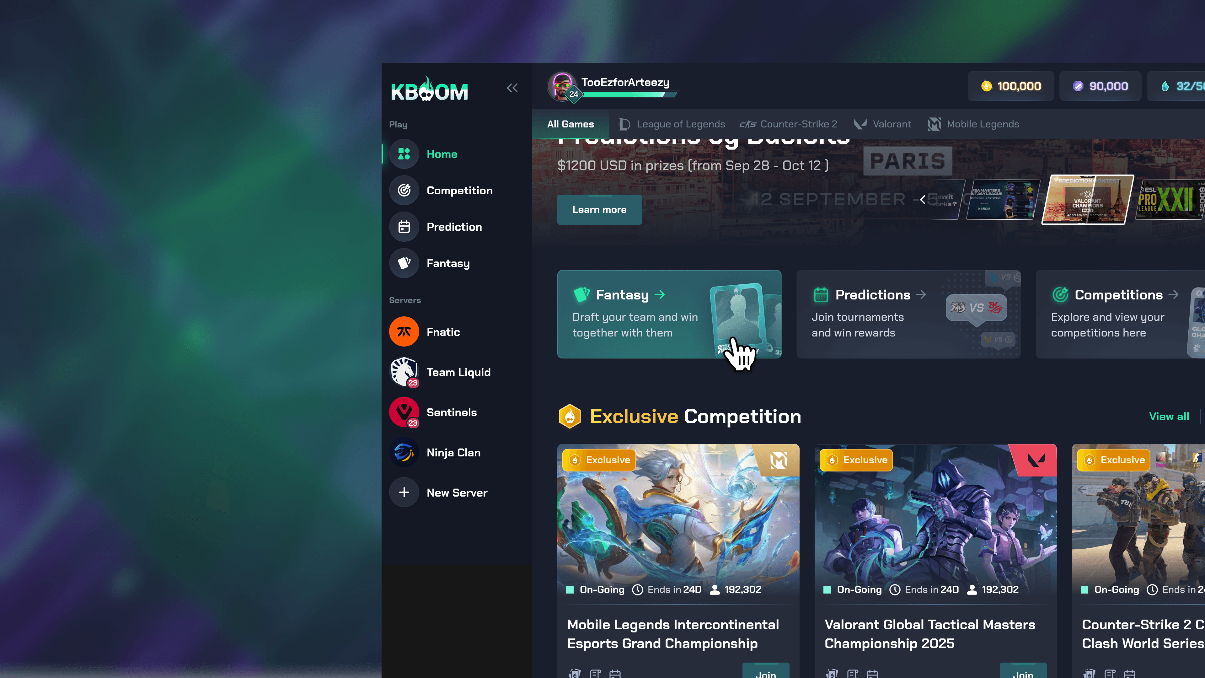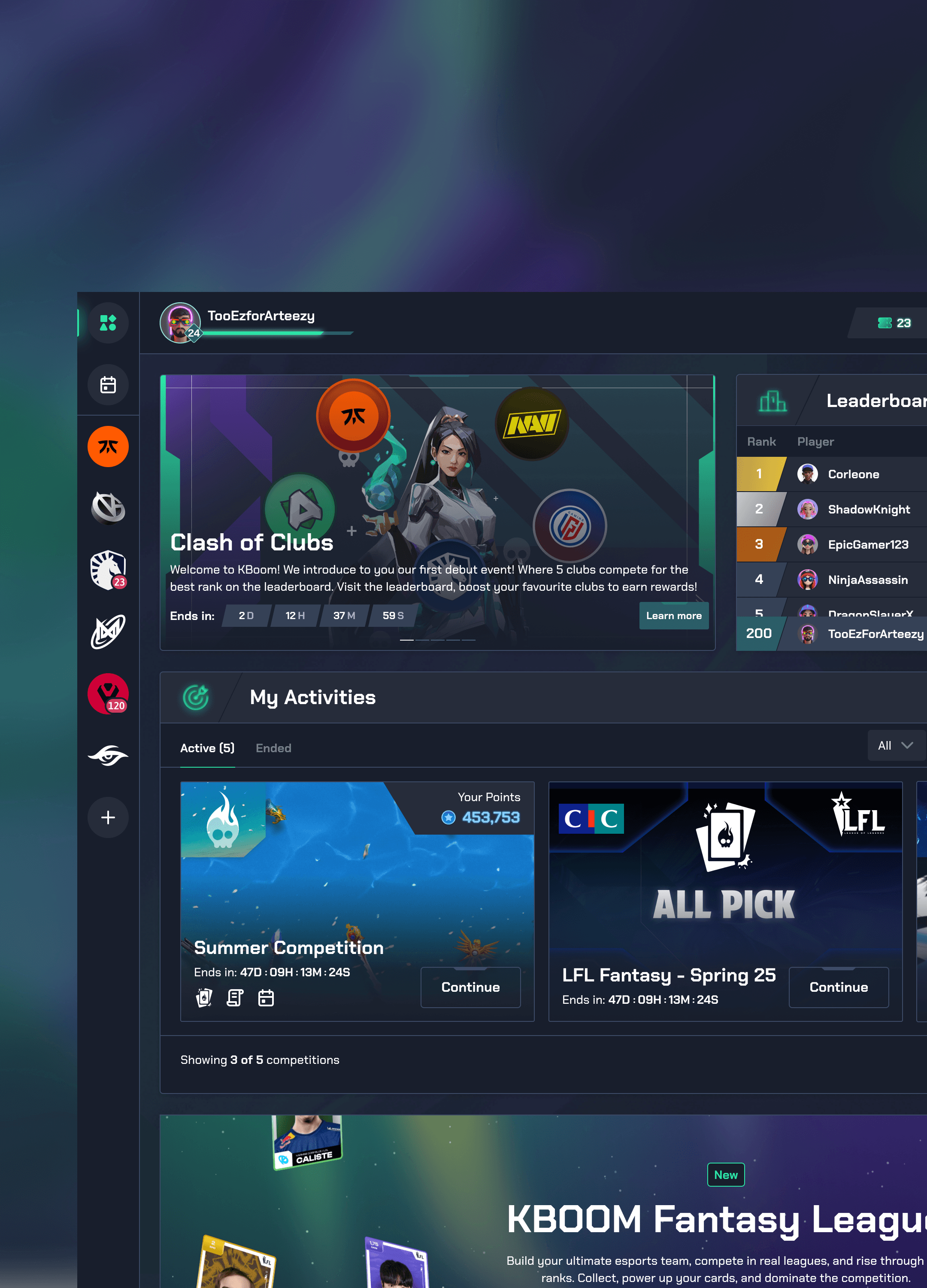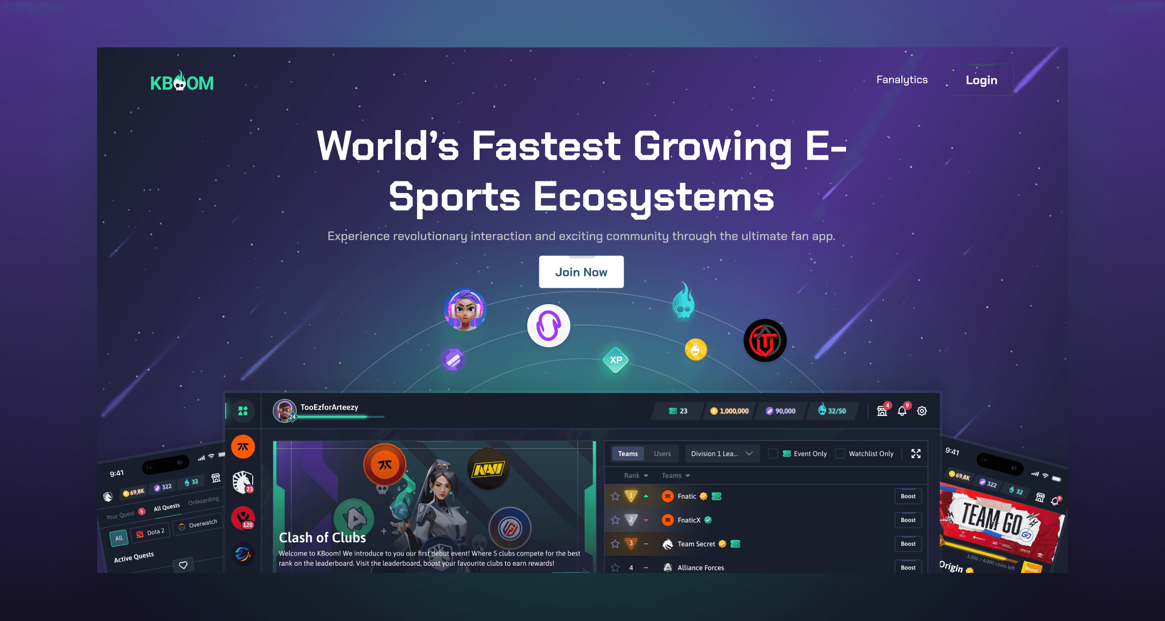 KBOOM is an esports fan engagement platform connecting fans to the games, teams, and leagues they love through quests, predictions, leaderboards, fantasy leagues, and rewards.